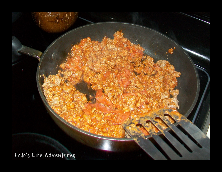 Mix together the drained ground beef, pizza sauce, and the pepperoni.