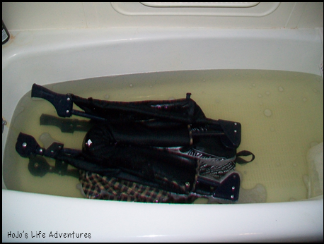 Next I took the base/mattress of the pack’n’play and put it on the bottom of my tub. It wanted to float, so I set the pack’n’play on top of it. I sloshed it around a bit, set the timer for 30 minutes, and walked away.